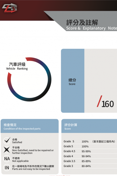 為令買賣雙方可以更容易了解車輛的狀態,CARSEXIT聯同香港汽車會 (The Hong Kong Automobile Association, HKAA) 特別合作制定一套獨有的專業驗車評級,報告檢驗評級參照日本汽車拍賣公司為評分準則,竭力為所有車主提供準確而可靠的資料!